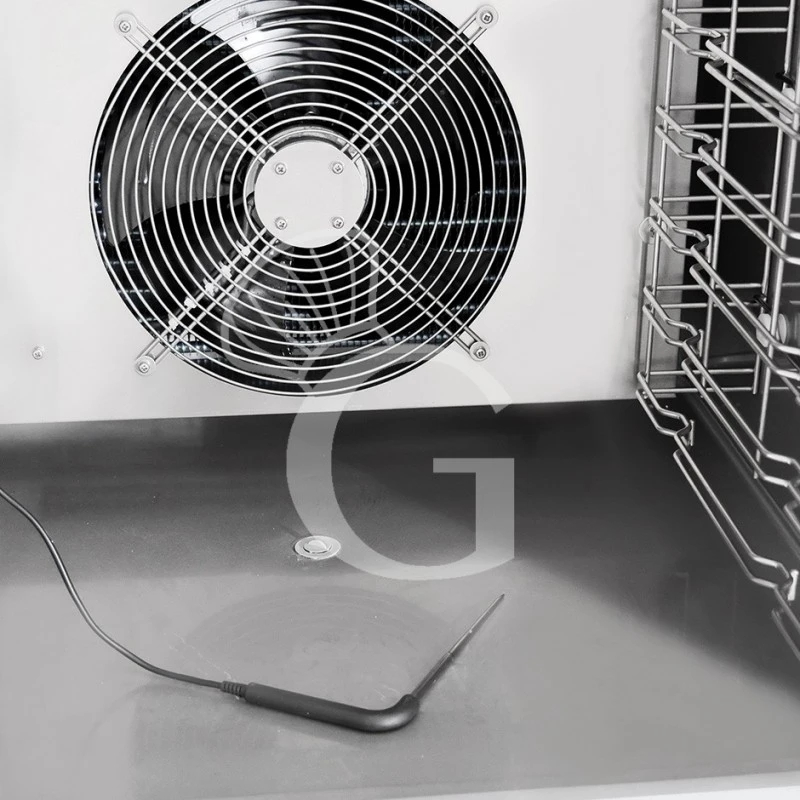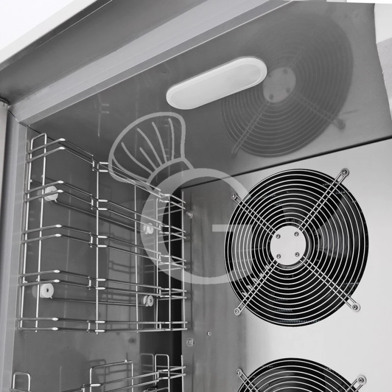 L’abbattitore presenta un gruppo refrigerante facilmente accessibile grazie ai pannelli anteriore e posteriore removibili, ciò significa che presenta un compressore studiato per poter lavorare con una resa del 100% fino ad una temperatura massima, dell’ambiente in cui è posto, con 65% di umidità relativa.