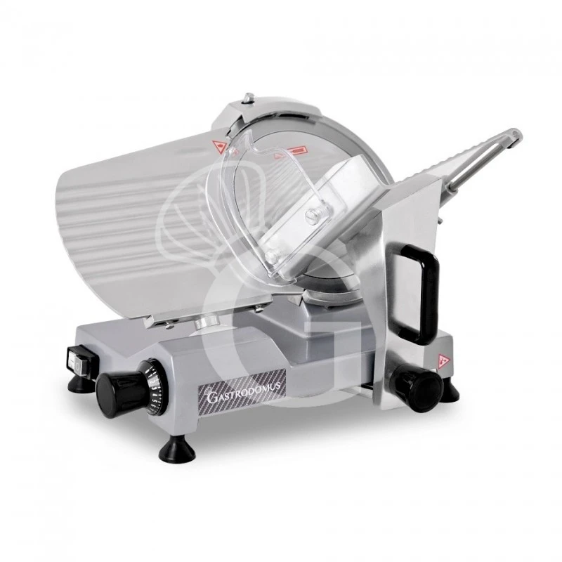 L’affettatrice ha una struttura in acciaio inox e lega di alluminio trattato per alimenti (corpo rivestito in alluminio) con lama di diametro 250 mm e robusto pressamerce.