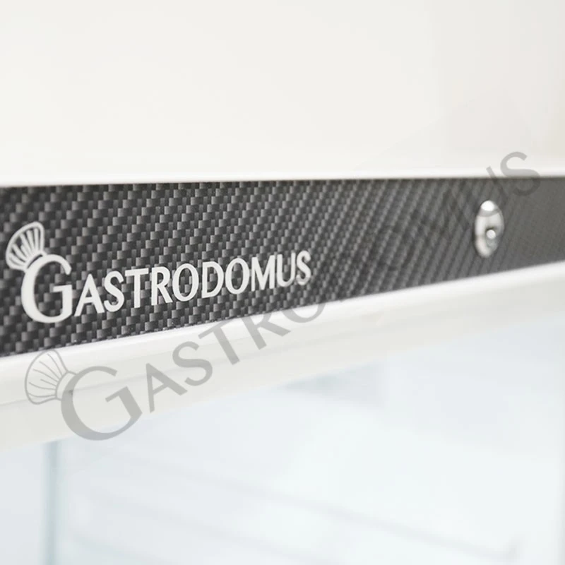 L’armadio refrigerato ha una struttura esterna in lamiera verniciata epossidica bianca e una struttura interna in ABS, mentre i pannelli esterni di fondo e il retro sono in lamiera zincata.