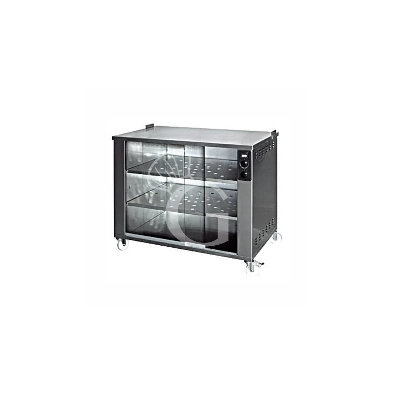 L’armadio termico è dotato di vetri frontali scorrevoli, ripiano intermedio, termostato e illuminazione.