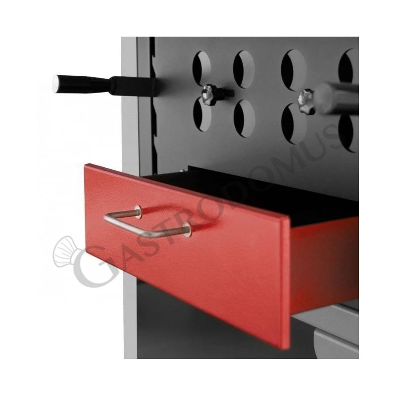 E’ dotato di 2 pozzetti per il contenimento del carbone vegetale con fondo in ghisa, regolabili in altezza, con 5 livelli di cottura, per aumentare o diminuire in base alle cotture la temperatura sui cibi da cuocere. Sotto alla griglia sono presenti delle bocchette regolabili per l’ingresso dell’aria sotto alla griglia.