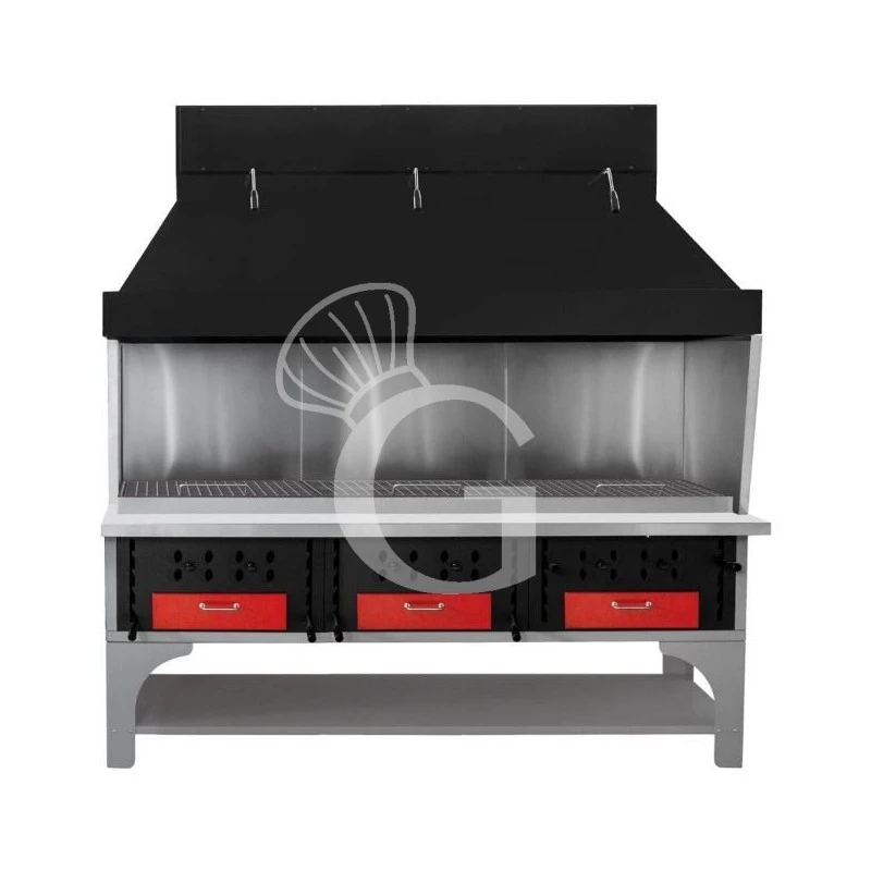 E’ dotato di 3 pozzetti per il contenimento del carbone vegetale con fondo in ghisa, regolabili in altezza, con 5 livelli di cottura, per aumentare o diminuire in base alle cotture la temperatura sui cibi da cuocere. Sotto alla griglia sono presenti delle bocchette regolabili per l’ingresso dell’aria sotto alla griglia.