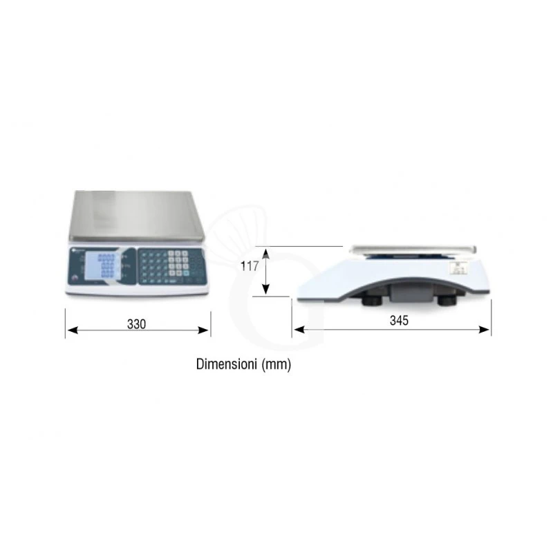 Bilancia commerciale con doppio schermo, portata 15 Kg e precisione 2 g fino a 6 Kg e 5 g da 6 a 15 Kg. Dimensioni L 330 mm x P 345 mm x H 117 mm.
