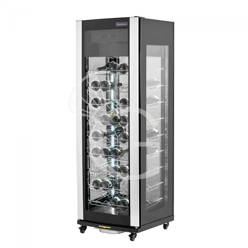 Cantina vino 4 lati vetro ventilata, porta a vetro, curvo con finitura in acciaio, 9 ripiani, 81 bottiglie, temp +5°C/+18°C