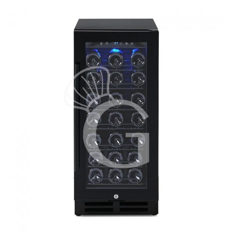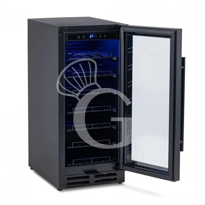 L’apparecchio ha una capacità di circa 31 bottiglie di capacità 750 ml (dimensione bottiglia: diametro 80 mm x H 300 mm) e presenta una zona refrigerata con la possibilità di regolare la temperatura in un range +5°C/+22°C.