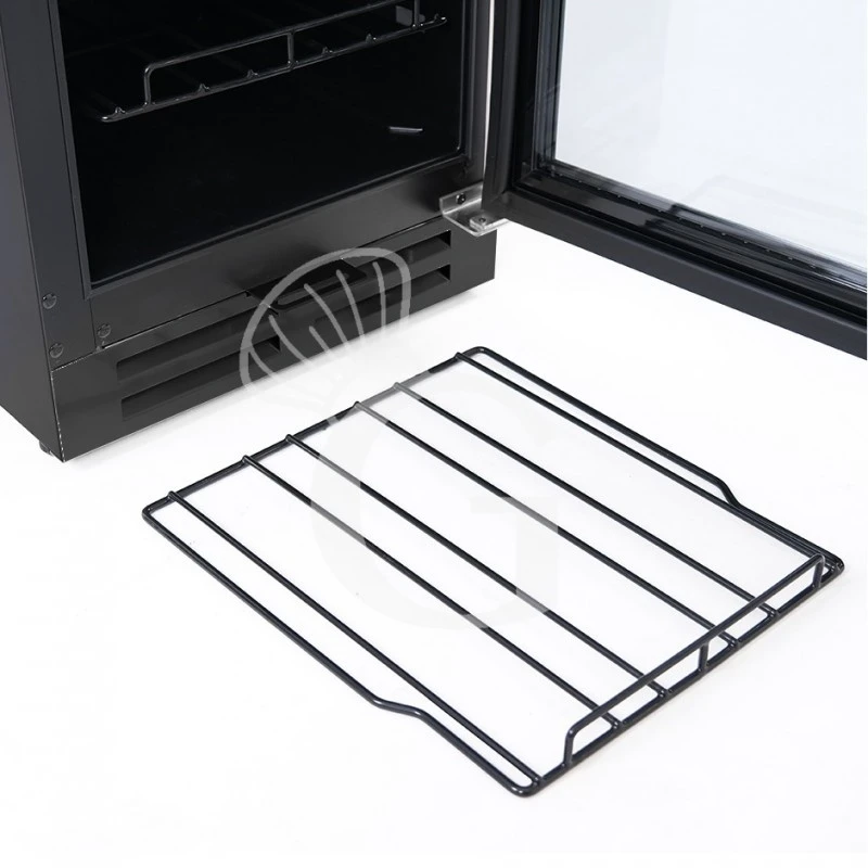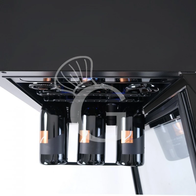 La cantina vino ha al suo interno 7 ripiani estraibili su guide stampate dove stoccare le bottiglie (5 bottiglie per ripiano, ultimi 2 ripiani invece 3 bottiglie ciascuno)e presenta una luce interna a LED di colore blu. La distanza tra i ripiani è di 80 mm.