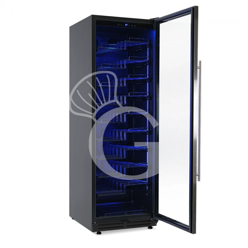 L’apparecchio ha una capacità di circa 119 bottiglie di capacità 750 ml (dimensione bottiglia: diametro 80 mm x H 300 mm) e presenta una zona refrigerata con la possibilità di regolare la temperatura in un range da +5°C/+22°C.