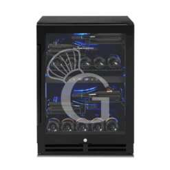 L’apparecchio ha una capacità di circa 34 bottiglie di capacità 750 ml (dimensione bottiglia: diametro 80 mm x H 300 mm) e presenta due zone refrigerate con la possibilità di regolare la temperatura in un range +5°C/+12°C nel vano superiore, e +12°C/+22°C nel vano inferiore.