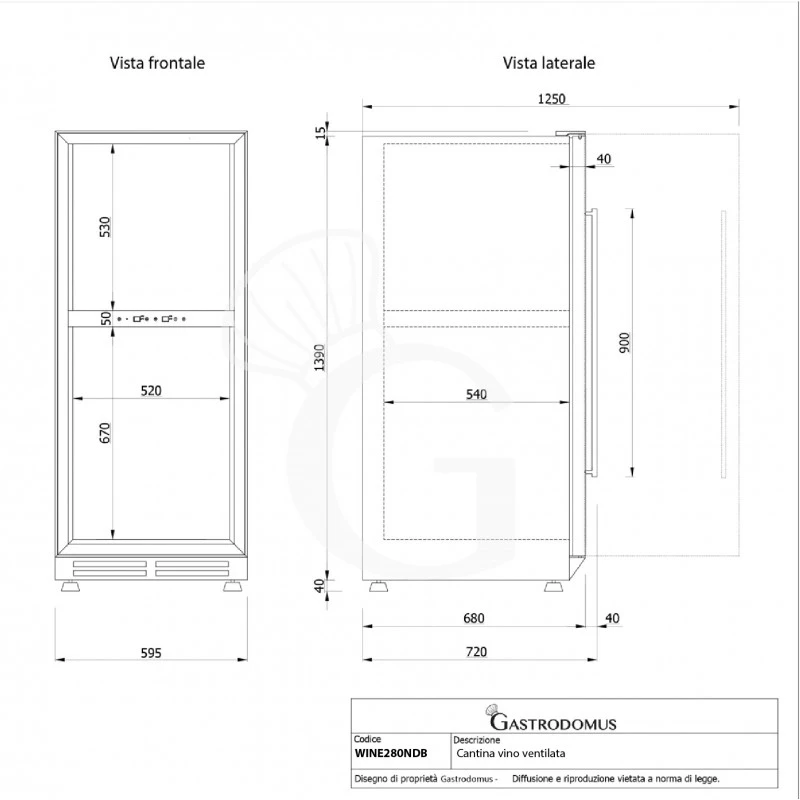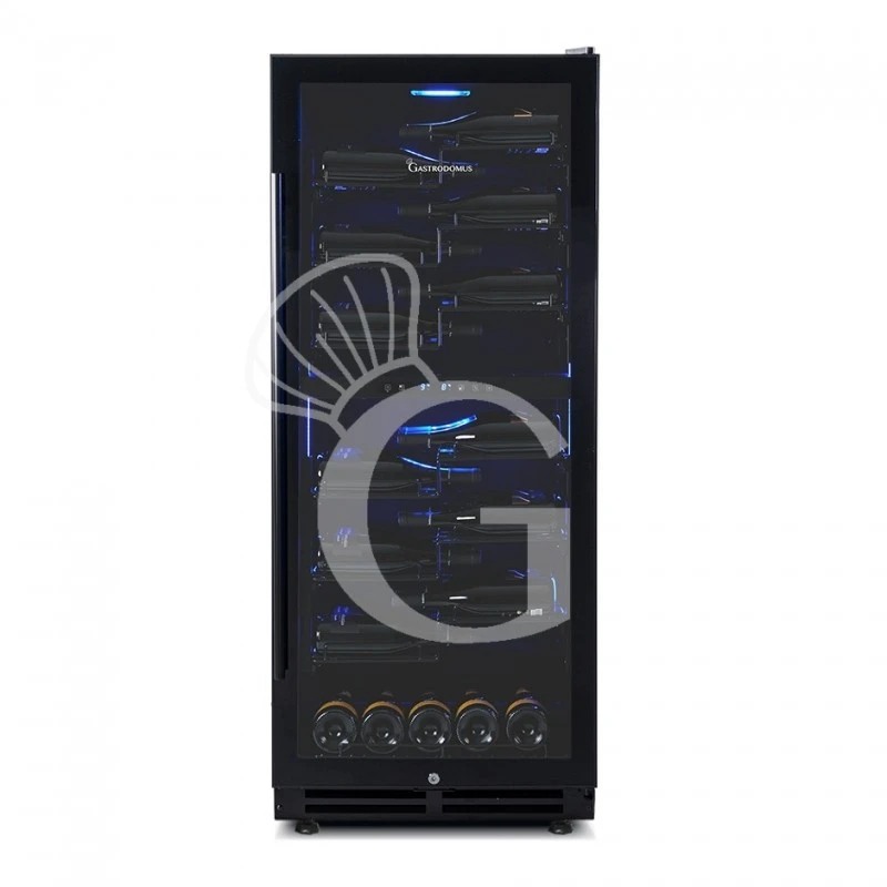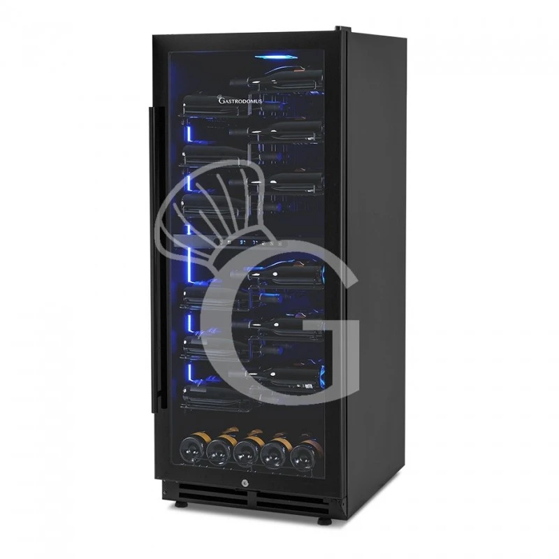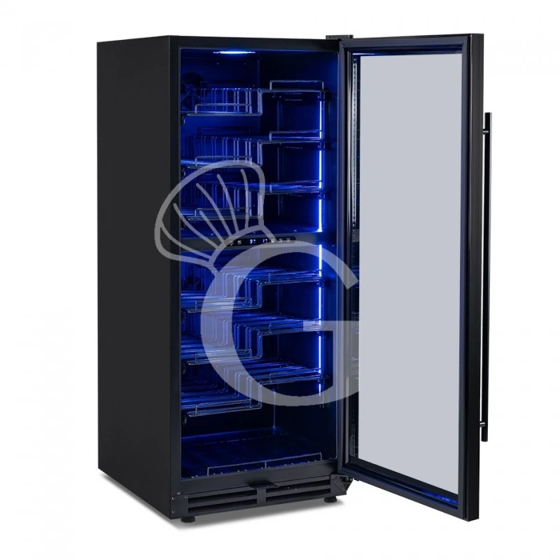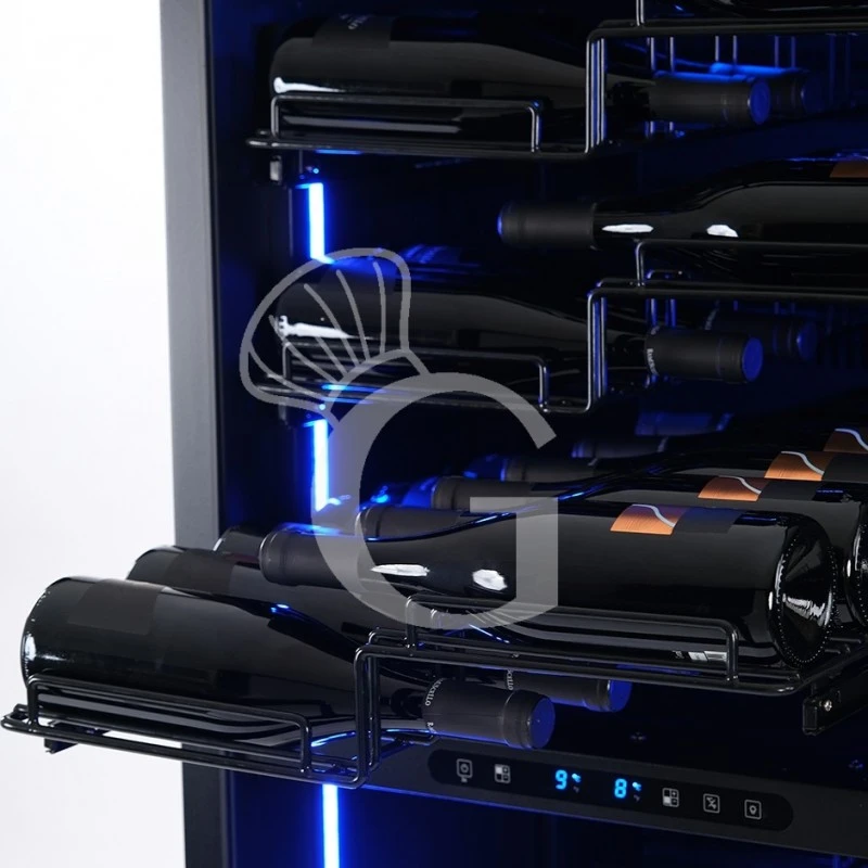 L’apparecchio ha una capacità di circa 83 bottiglie di capacità 750 ml (dimensione bottiglia: diametro 80 mm x H 300 mm) e presenta due zone refrigerate con la possibilità di regolare la temperatura in modo indipendente in un range da +5°C/+12°C nel vano superiore, e da +12°C/+22°C nel vano inferiore.