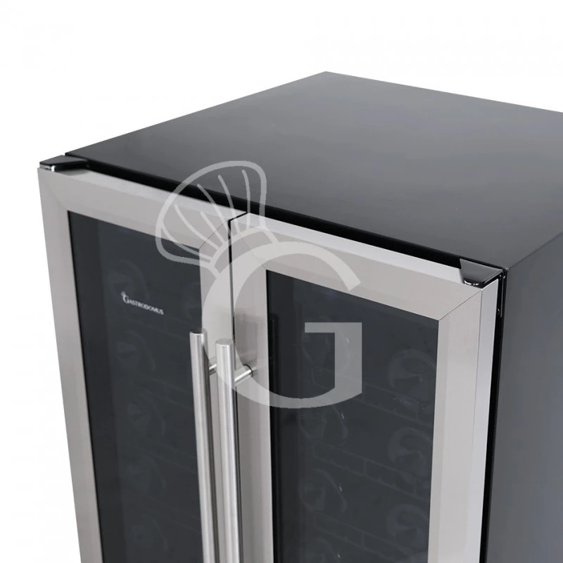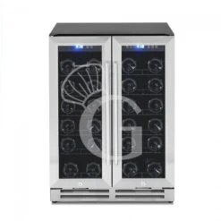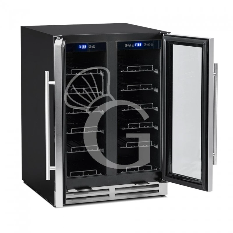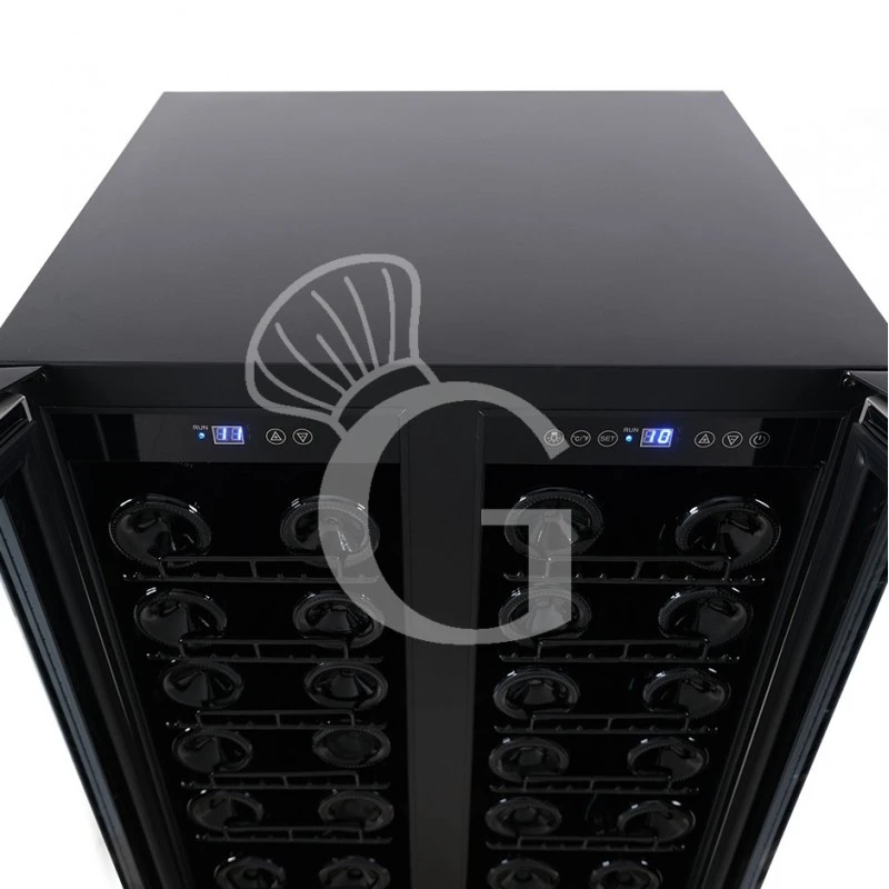 L’apparecchio ha una capacità di circa 34 bottiglie di capacità 750 ml (dimensione bottiglia: diametro 80 mm x H 300 mm) e presenta due zone refrigerate con la possibilità di regolare la temperatura in un range +5°C/+12°C nel vano superiore, e +12°C/+22°C nel vano inferiore.