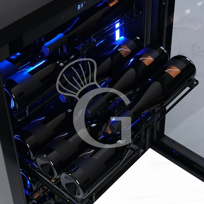 L’apparecchio ha una capacità di circa 36 bottiglie di capacità 750 ml (dimensione bottiglia: diametro 80 mm x H 300 mm) e presenta una zona refrigerata con la possibilità di regolare la temperatura in un range +5°C/+22°C.