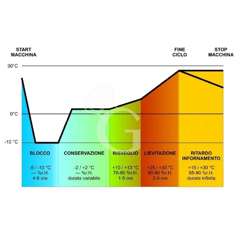 La fermalievitazione infatti permette di controllare la fermentazione e viene utilizzata per gli impasti di pane e pasticceria attraverso l’opportuna gestione di temperatura, umidità e tempo. L’armadio fermalievitazione blocca o rallenta l’attività fermentativa del lievito, mantiene l’impasto in questo stato per alcune ore e infine inizia automaticamente la fase di fermentazione all’orario stabilito dal programma. L’intero grafico del funzionamento è suddiviso in 5 fasi ed è indicato nell’immagine in allegato.
