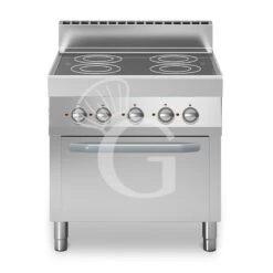 Cucina elettrica con piano di cottura in vetroceramica, forno elettrico a convezione GN2/1, profondità 700 mm.
