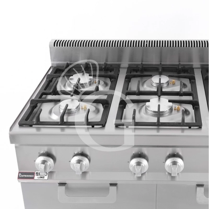 La struttura esterna del piano di cottura a gas è in acciaio INOX-AISI304, con spessore 12/10. Il piano di cottura è allestito su armadio chiuso con 2 vani.