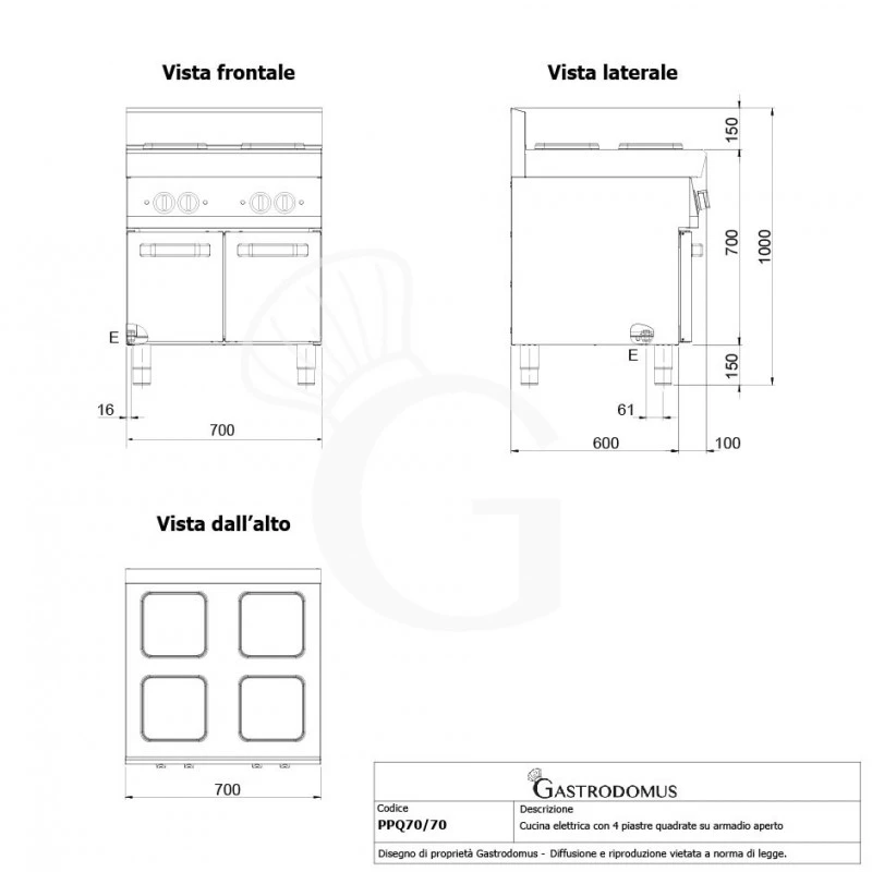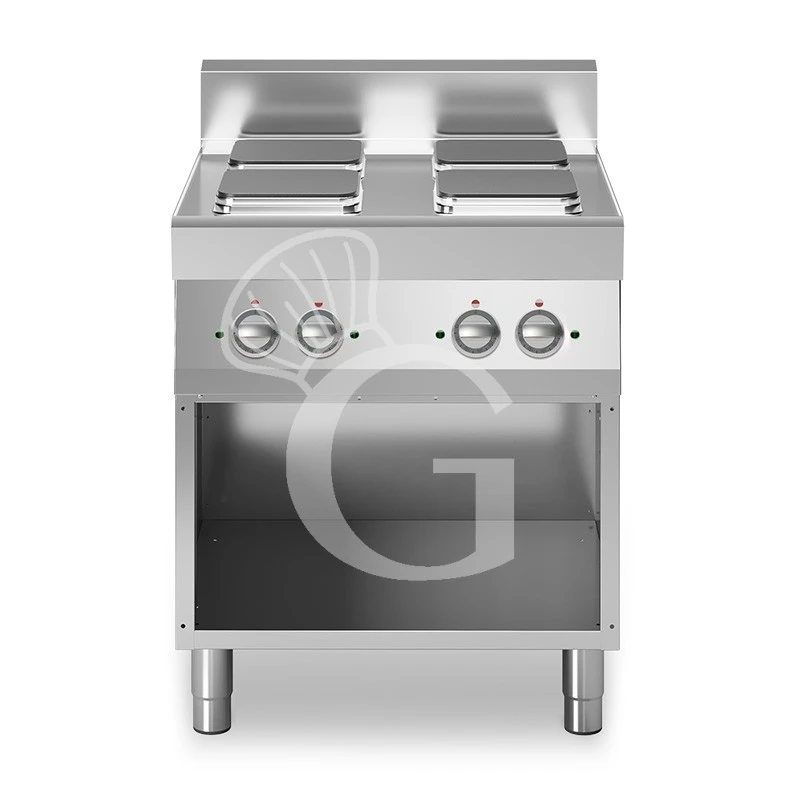 Cucina Professionale Elettrica 4 Piastre Quadrate Su Armadio Aperto Profondità 700 Mm