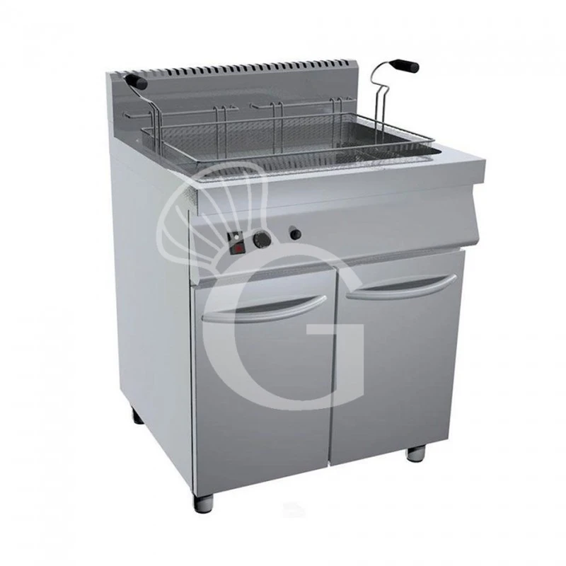 Friggitrice a gas per pasticceria alloggiata su mobile con 1 vasca di capacità 45 litri.