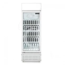 L’espositore refrigerato ventilato per bibite ha porta battente e l’esterno di colore bianco.