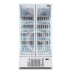 L’espositore refrigerato ventilato per bibite ha 2 porte battenti e di colore bianco.