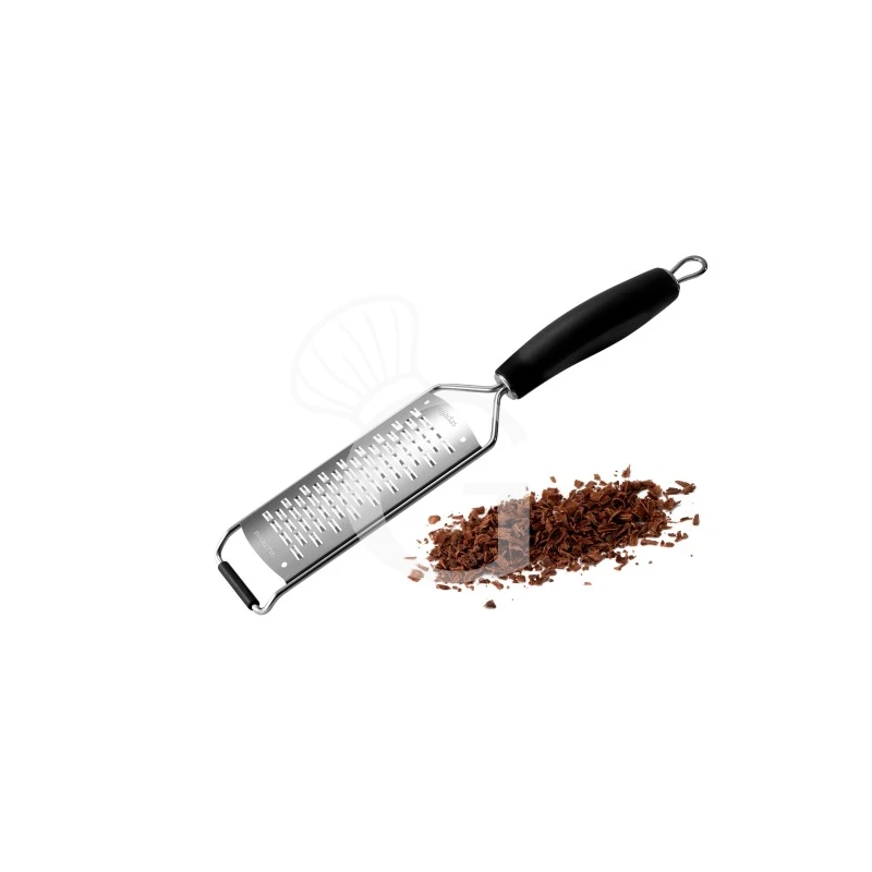 Grattugia in acciaio inox con manico, doppio taglio, lunghezza 315 mm e larghezza 73 mm.