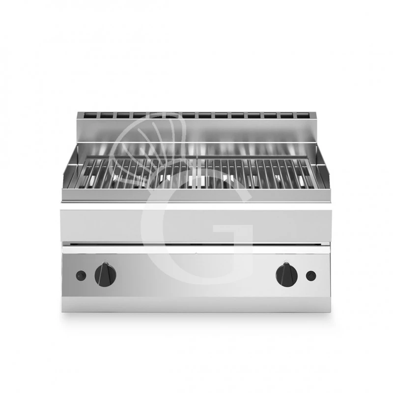 Griglia a gas da banco con 2 zone di cottura in acciaio e profondità 650 mm.