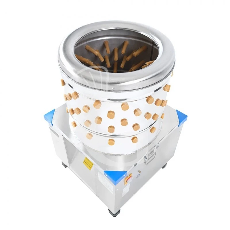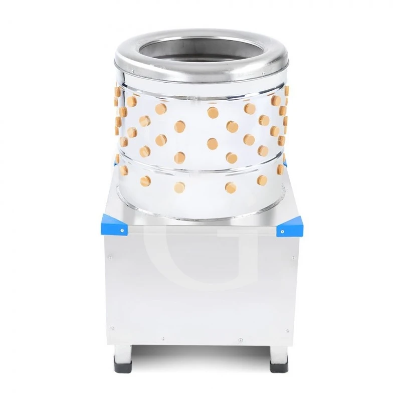 La spiumatrice automatica ha una robusta struttura in acciaio inox con tamburo fisso dotato di 116 dita in gomma naturale. I materiali di costruzione sono facili da pulire e rendono anche il macchinario semplice nella manutenzione.