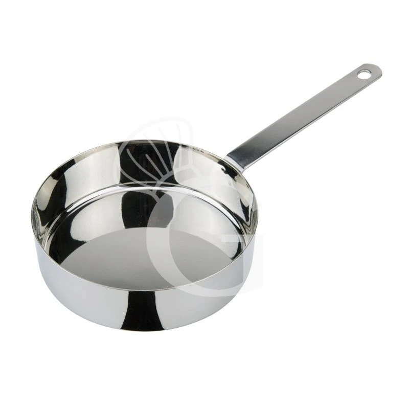 Mini padella in acciaio inox con diametro 120 mm e altezza 35 mm.