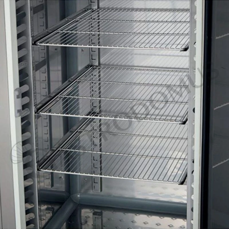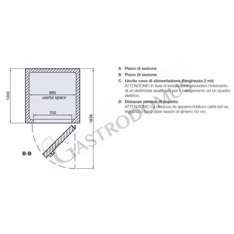 La minicella a temperatura positiva è realizzata internamente ed esternamente con pannelli smontabili in lamiera INOX AISI304, mentre il fondo della cella è in acciaio inox AISI304 bugnato antiscivolo. Lo spessore dei pannelli è di 70 mm, mentre la capacità interna della cella è di 1400 litri con dimensioni nette del passaggio della porta di 680 mm x H 1600 mm. All’interno della cella i profili sanitari raggiati sono realizzati in PVC per uso alimentare.