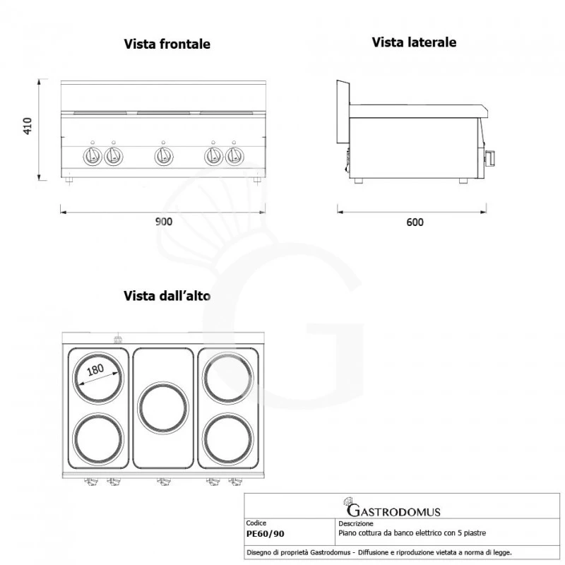Il piano di cottura è dotato di 5 piastre elettriche in ghisa fissate ermeticamente al piano che hanno diametro di 180 mm e potenza di 1,5 Kw ognuna. Le piastre hanno inoltre bordo in acciaio INOX a tenuta e ogni piastra presenta un commutatore con 6 possibilità di regolazione della temperatura di lavoro.