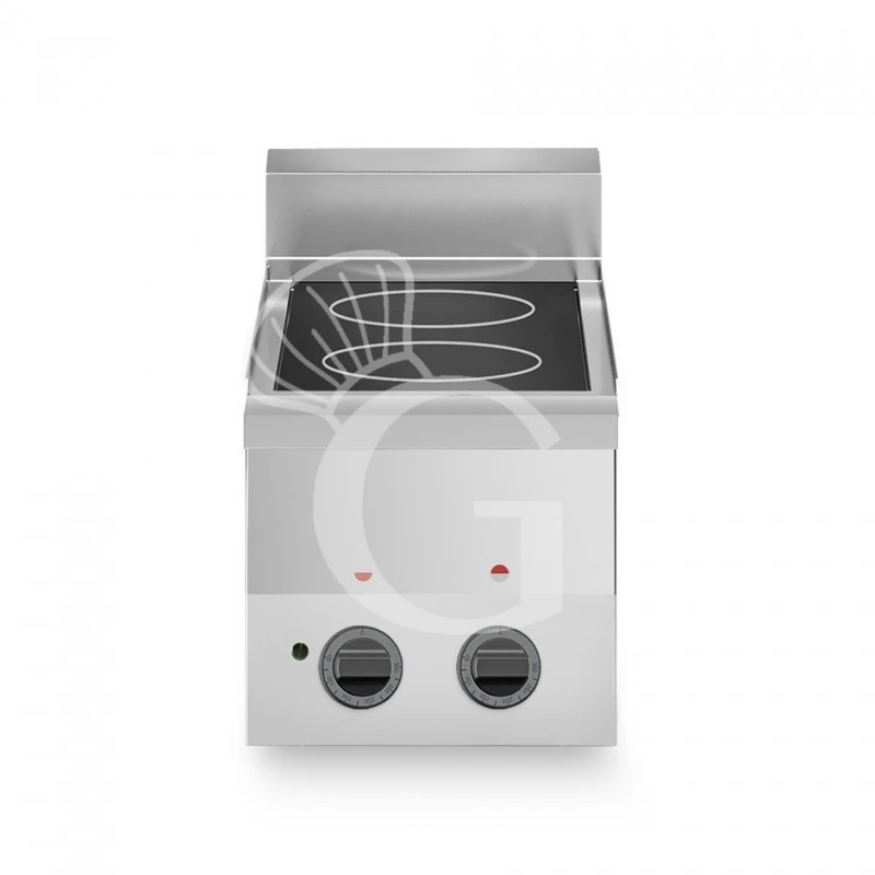 Il piano di cottura è in vetroceramica sigillato ermeticamente al piano con 2 zone di cottura indipendenti, ciascuna con elementi radianti da 1,8 Kw di potenza e controllate da regolatore di energia. Le zone riscaldate sono delimitate da contorni serigrafati sul vetro.