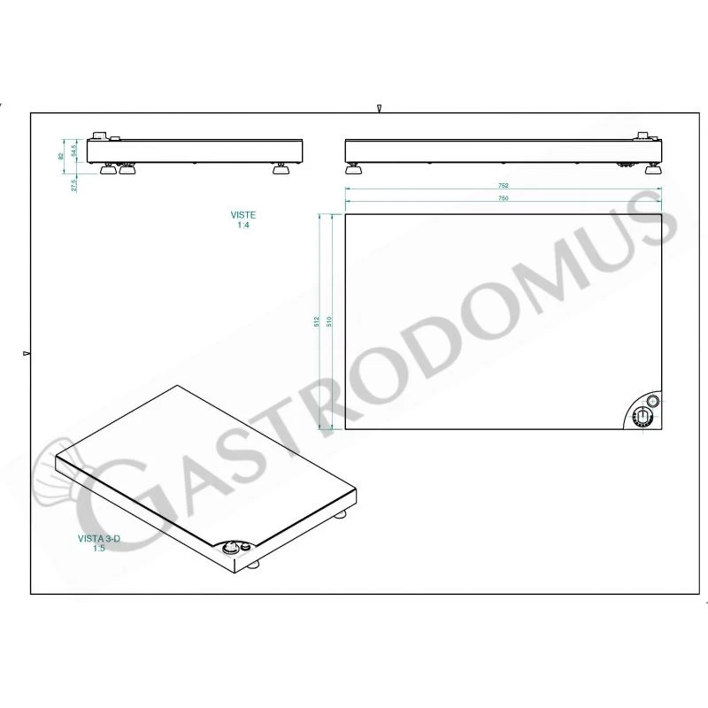 L 750 mm x P 510 mm x H 60 mm (+ 20 con piedini)