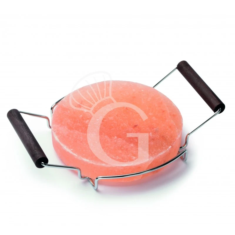 Piastra di sale rosa rotonda con telaio cromato manici legno, Ø 200 mm.
