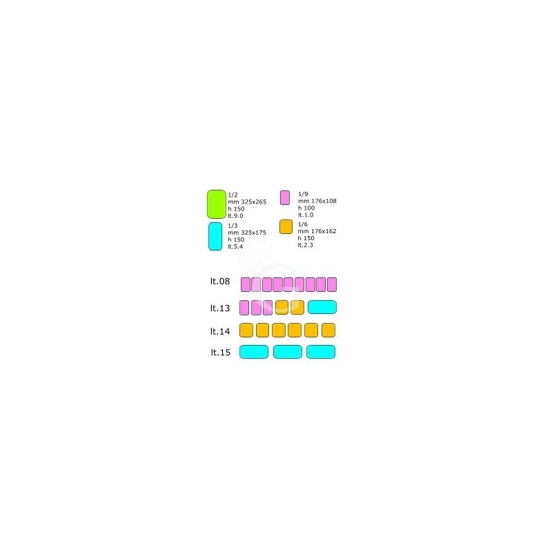 Bacinelle e coperchi esclusi. Le combinazioni con le bacinelle da 1/6 e da 1/9 richiedono l’acquisto di supporti. Contattare l’ufficio commerciale per info.
