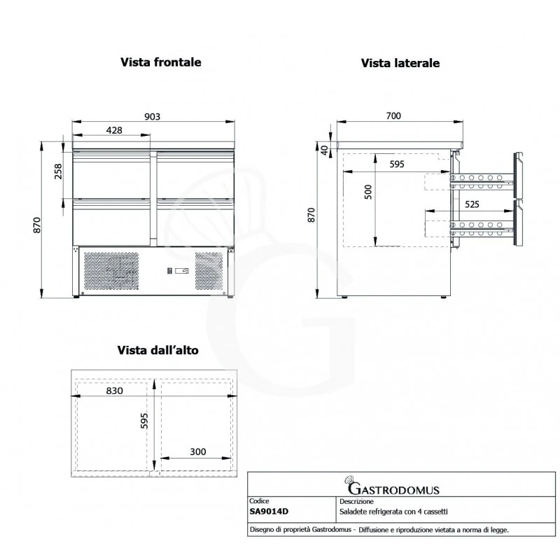 Saladette refrigerazione statica con 4 cassetti, piano in inox e temperatura +2°C/+8°C.