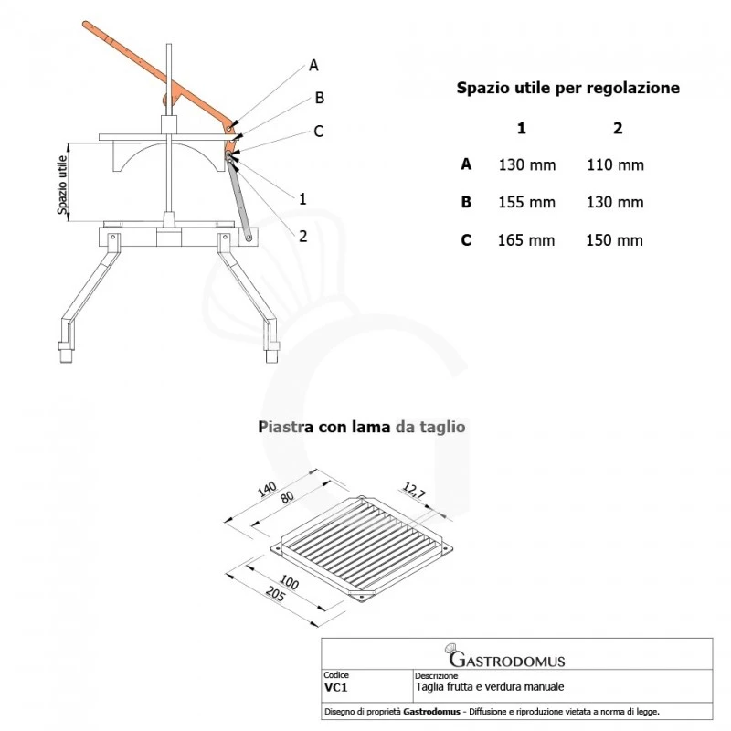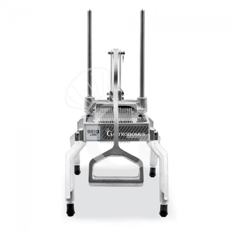 Questo strumento consente di tagliare perfettamente frutta oppure verdura in bastoncini uguali fra loro. Sono presenti 3 livelli di regolazione dell’altezza, in base alla grandezza della verdura o della frutta che si intende appoggiare sopra al disco. Il prodotto sopra al disco va posizionato in modo orizzontale, seguendo quindi la forma della pressa. Diversamente non sarà possibile eseguire il taglio.