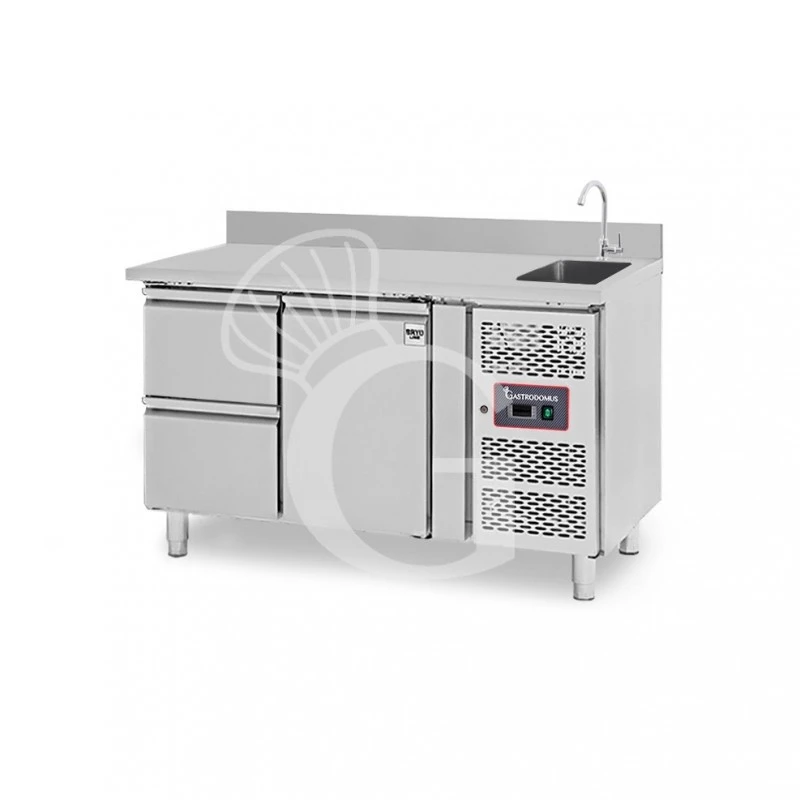 Tavolo lavello armadiato refrigerato con alzatina provvisto di 2 cassetti e 1 porta, profondità 700 mm, temperatura +2°C/+8°C – rubinetto Ø 25 mm.