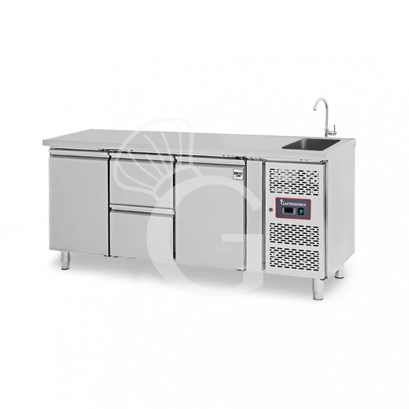 Tavolo lavello armadiato refrigerato provvisto di 2 cassetti 2 porte, profondità 700 mm, temperatura +2°C/+8°C– rubinetto Ø 25 mm.