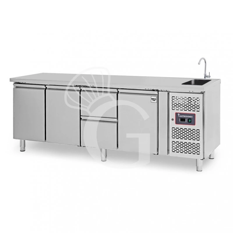 Tavolo lavello armadiato refrigerato provvisto di 2 cassetti 3 porte, profondità 700 mm, temperatura +2°C/+8°C– rubinetto Ø 25 mm.