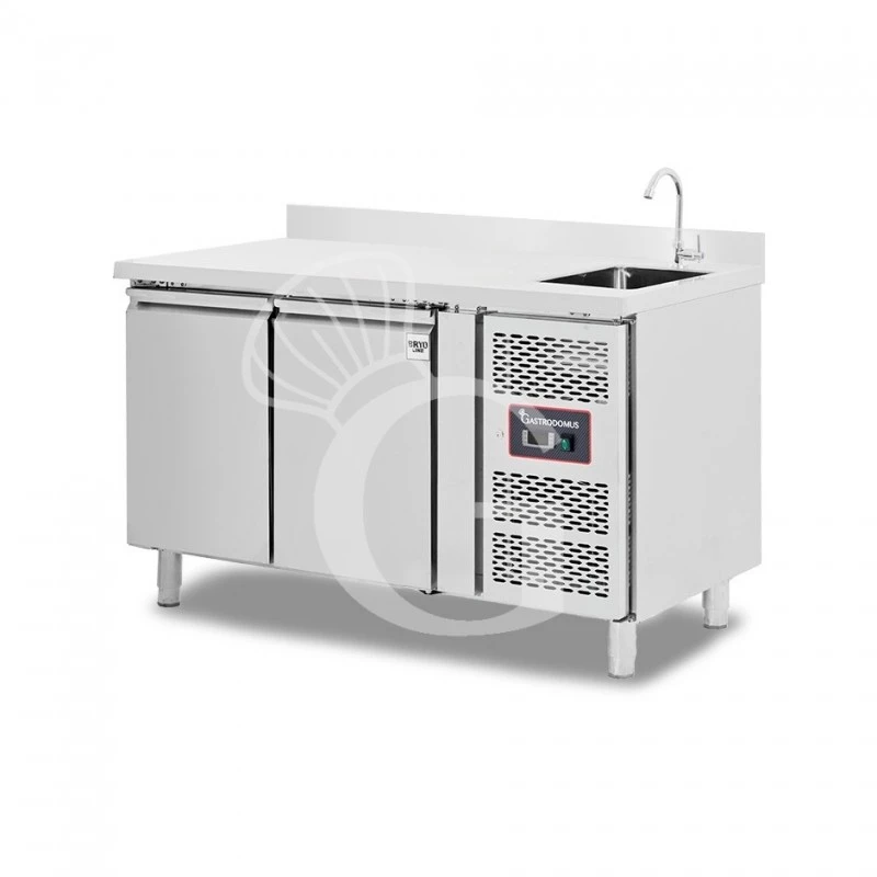 Tavolo lavello armadiato refrigerato con alzatina provvisto di 2 porte, profondità 700 mm, temperatura +2°C/+8°C – rubinetto Ø 25 mm.