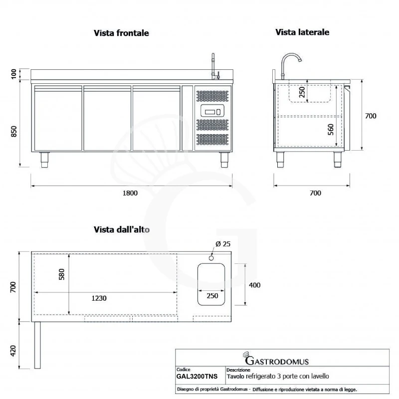 Tavolo lavello armadiato refrigerato provvisto di 3 porte con alzatina, profondità 700 mm, temperatura +2°C/+8°C– rubinetto Ø 25 mm.
