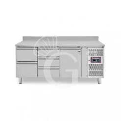 Tavolo refrigerato dotato di 1 porta, 2 cassetti 1/2 sinistra + 3 cassetti 1/3 sinistra e alzatina, profondità 700 mm, temperatura -2°C/+8°C.