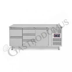Tavolo refrigerato provvisto di 1 porta e 2 cassetti da 1/2 sulla sinistra + 3 cassetti da 1/3 sulla sinistra, profondità 700 mm, temperatura -2°C/+8°C.