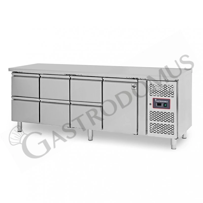 Tavolo refrigerato provvisto di 1 porta e 6 cassetti sulla sinistra da 1/2, profondità 700 mm, temperatura -2°C/+8°C.