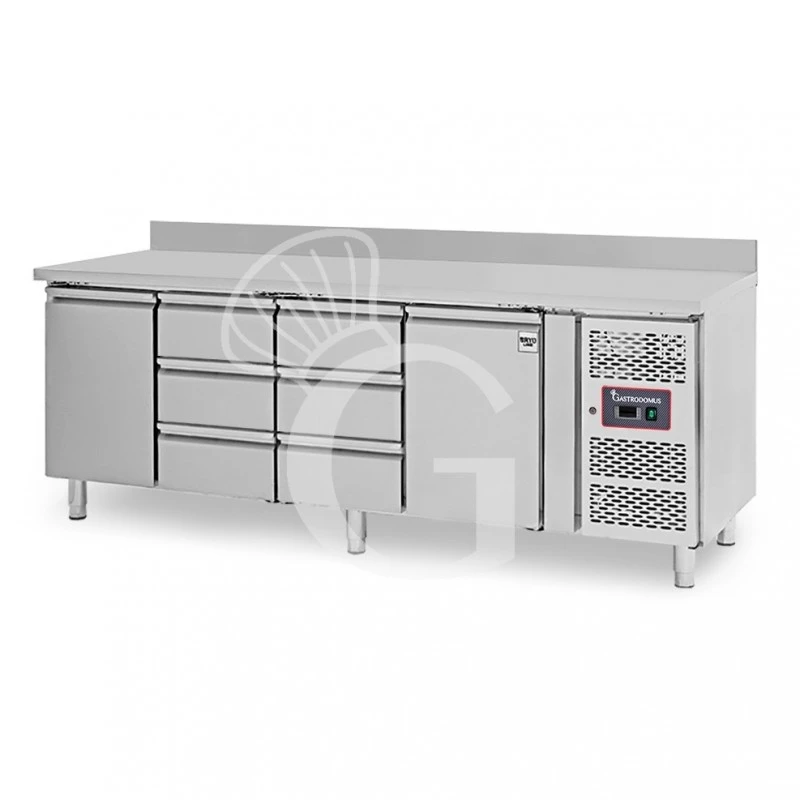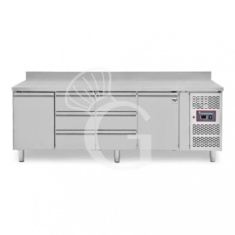 Tavolo refrigerato provvisto di 2 porte e 6 cassetti centrali da 1/3 con alzatina, profondità 700 mm, temperatura -2°C/+8°C.