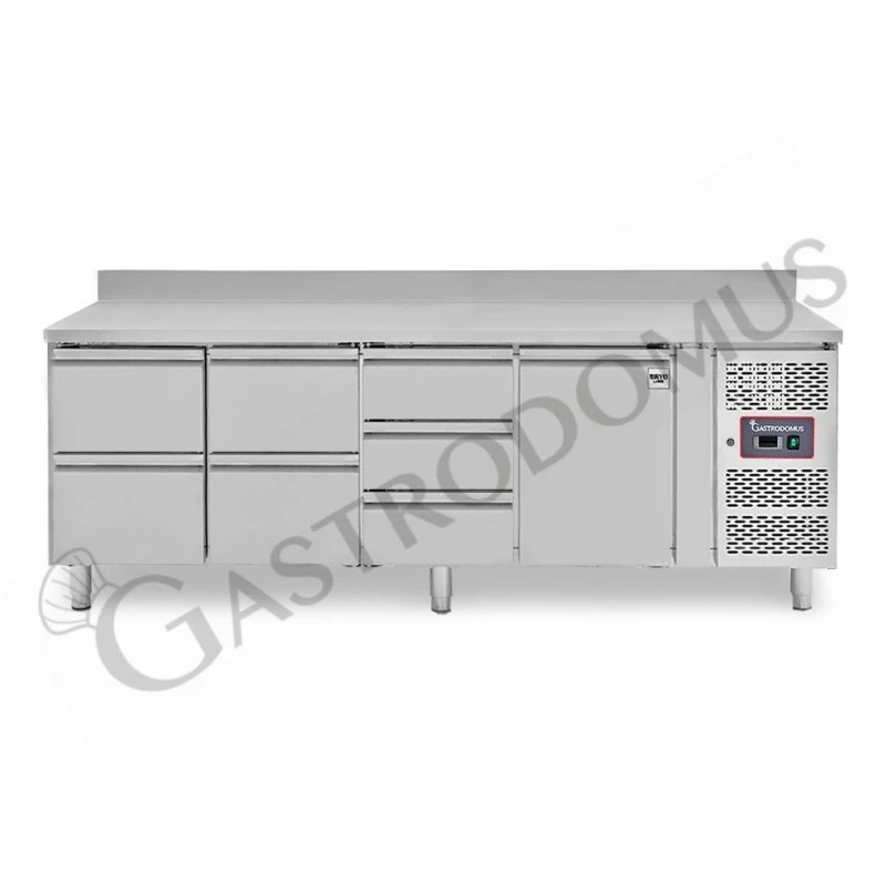 Tavolo refrigerato provvisto di 1 porta, 2 cassetti sinistra da 1/2 e 2 cassetti da 1/2 + 3 cassetti centrali da 1/3, con alzatina, profondità 700 mm, temperatura -2°C/+8°C.