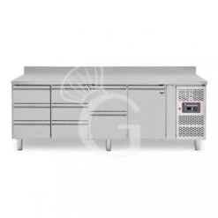 Tavolo refrigerato provvisto di 1 porta, 3 cassetti sinistra da 1/3, 3 cassetti centrali da 1/3 + 2 cassetti centrali da 1/2, con alzatina, profondità 700 mm, temperatura -2°C/+8°C.