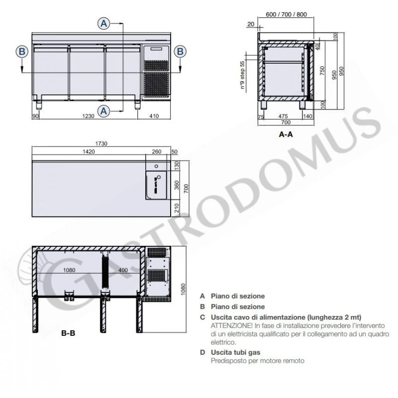 L 1730 mm x P 700 mm x H 950 mm - Profondità tavolo refrigerato
