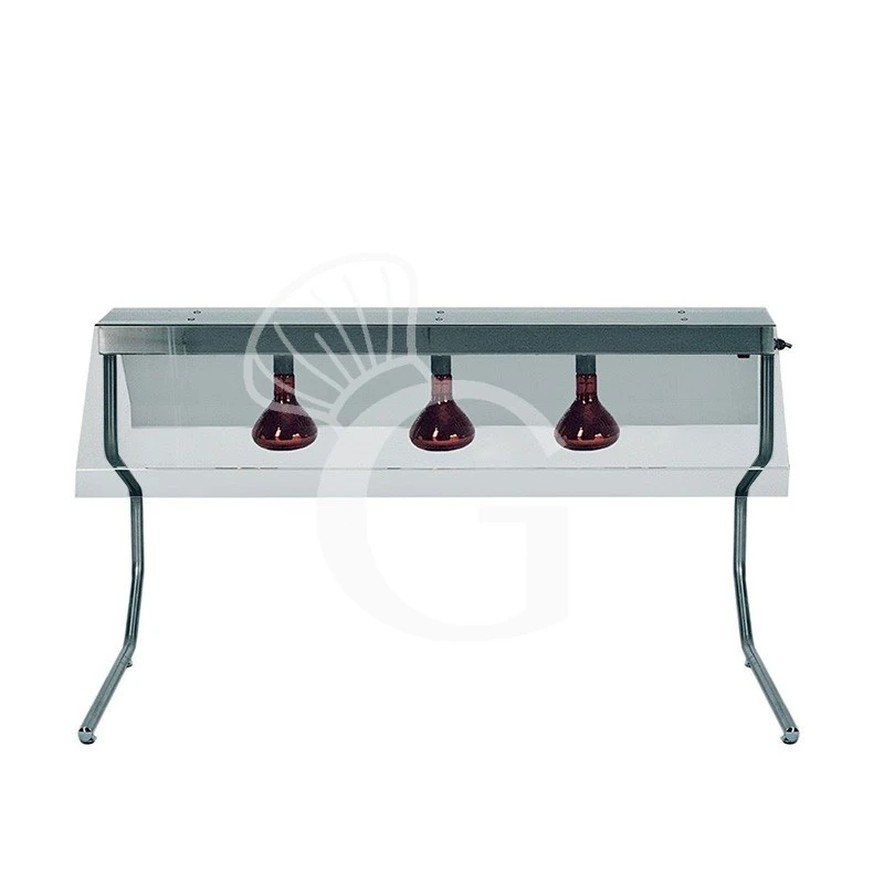 Il telaio è inoltre dotato di 3 lampade a raggi infrarossi. La lampada a raggi infrarossi è un buon metodo per mantenere il cibo caldo in ristoranti, alberghi, hotel, mense e strutture di catering. Le lampade permettono di mantenere i cibi in temperatura in modo che non si raffreddino nell’intervallo di tempo che intercorre tra la loro preparazione e il momento in cui vengono serviti. Il calore generato dalle lampade viene indirizzato in modo ottimale verso le pietanze per mantenerle alla temperatura adeguata e nello stesso tempo illuminarle per una piacevole esposizione. La lampada, inoltre, permette di conservare la giusta umidità e non alterare i sapori delle pietanze.