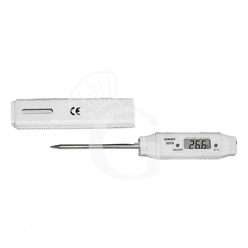 Termometro digitale impermeabile con display per una comoda lettura, inserito in una robusta custodia protettiva di colore bianco. Il termometro è dotato di sonda di lunghezza 70 mm.