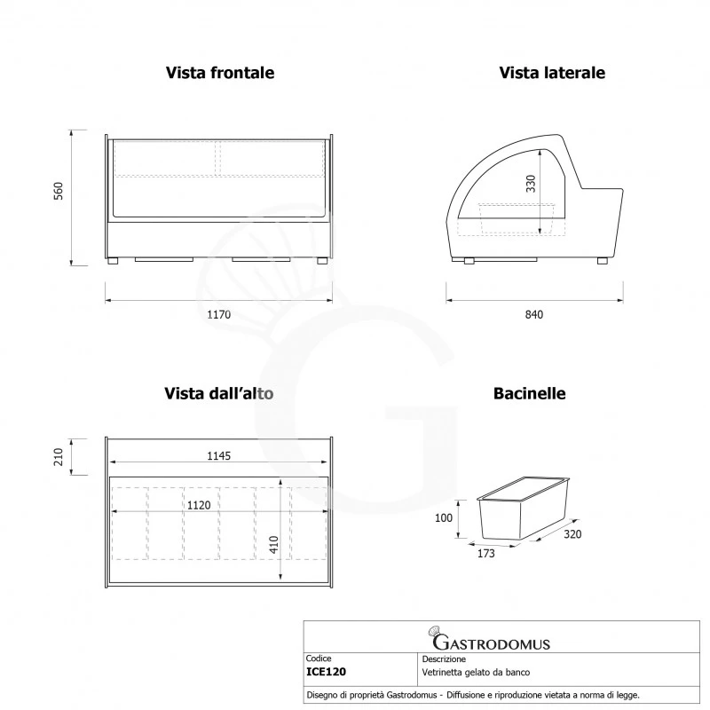 Vetrina Da Banco per Gelato -13°/-22°C – L 1170 mm x P 840 mm x H 560 mm.