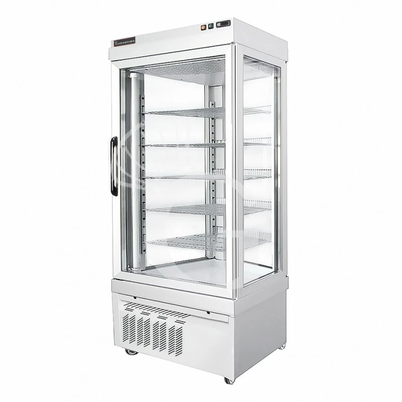 Espositore refrigerato statico positivo per pasticceria con 5 ripiani, capacità 630 litri e temperatura regolabile da +2°C/+10°C.